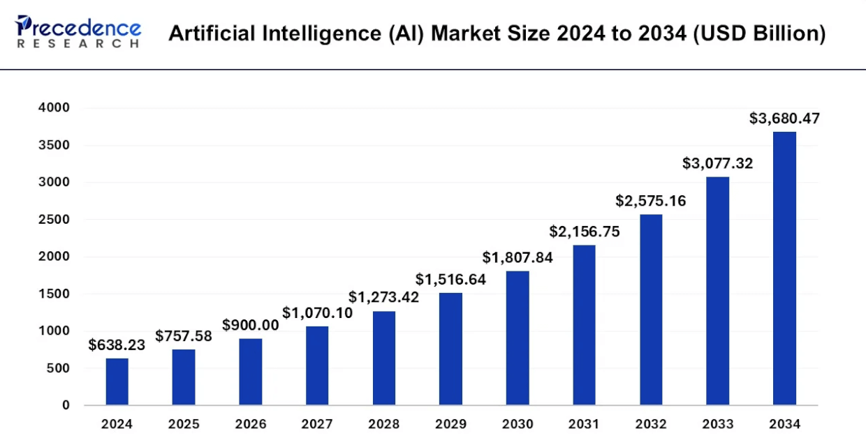 Meanwhile, the AI market is growing even faster, racing from $638 billion in 2024 to $3.7 trillion by 2034.